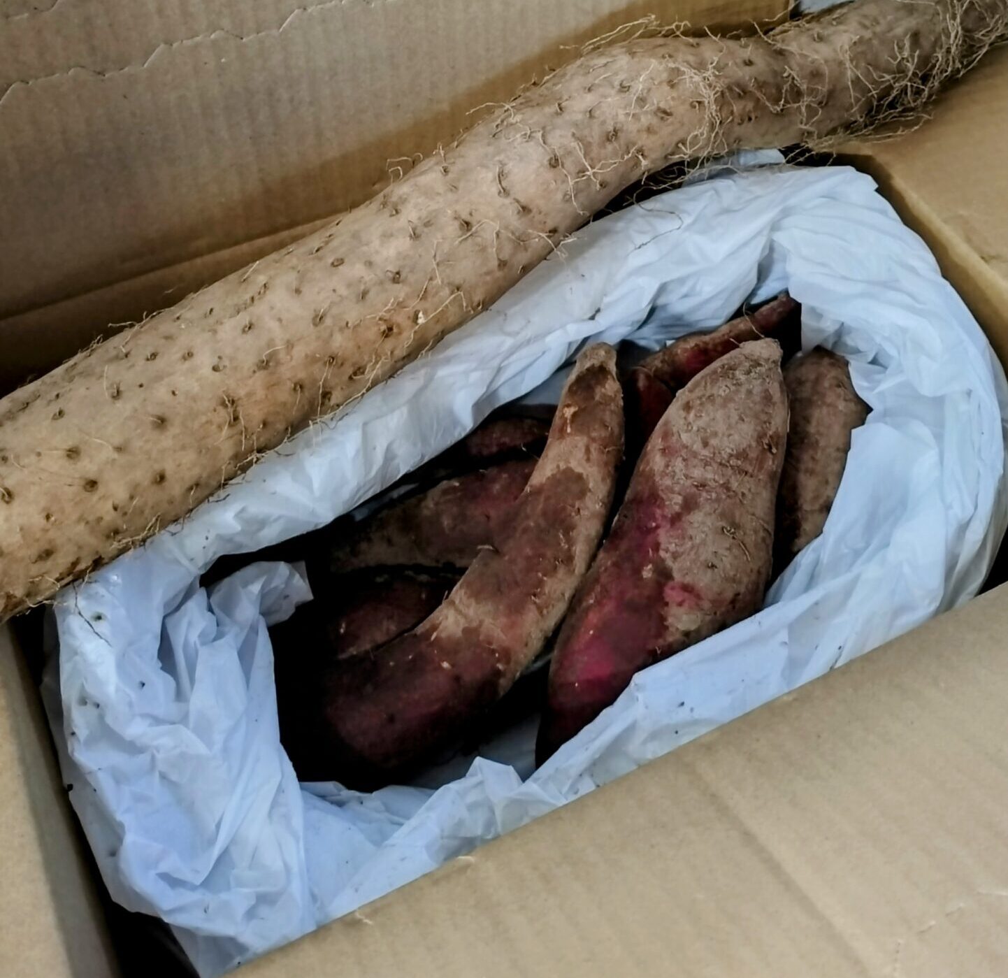 戸田さんが持って来てくれた長芋と丸山さんが持って来てくれたサツマイモ。どうやって食べようか…
